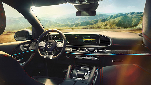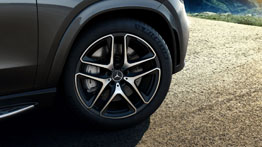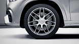 Легкосплавные колесные диски AMG диаметром 53,3 см (21") с 5 сдвоенными спицами, с черной матовой лакировкой, полированные, предлагаемые опционально, притягивают взгляды. Их благородный вид повышает привлекательность Mercedes-AMG GLE 53 4MATIC+ визуально и завершает общий спортивный образ.